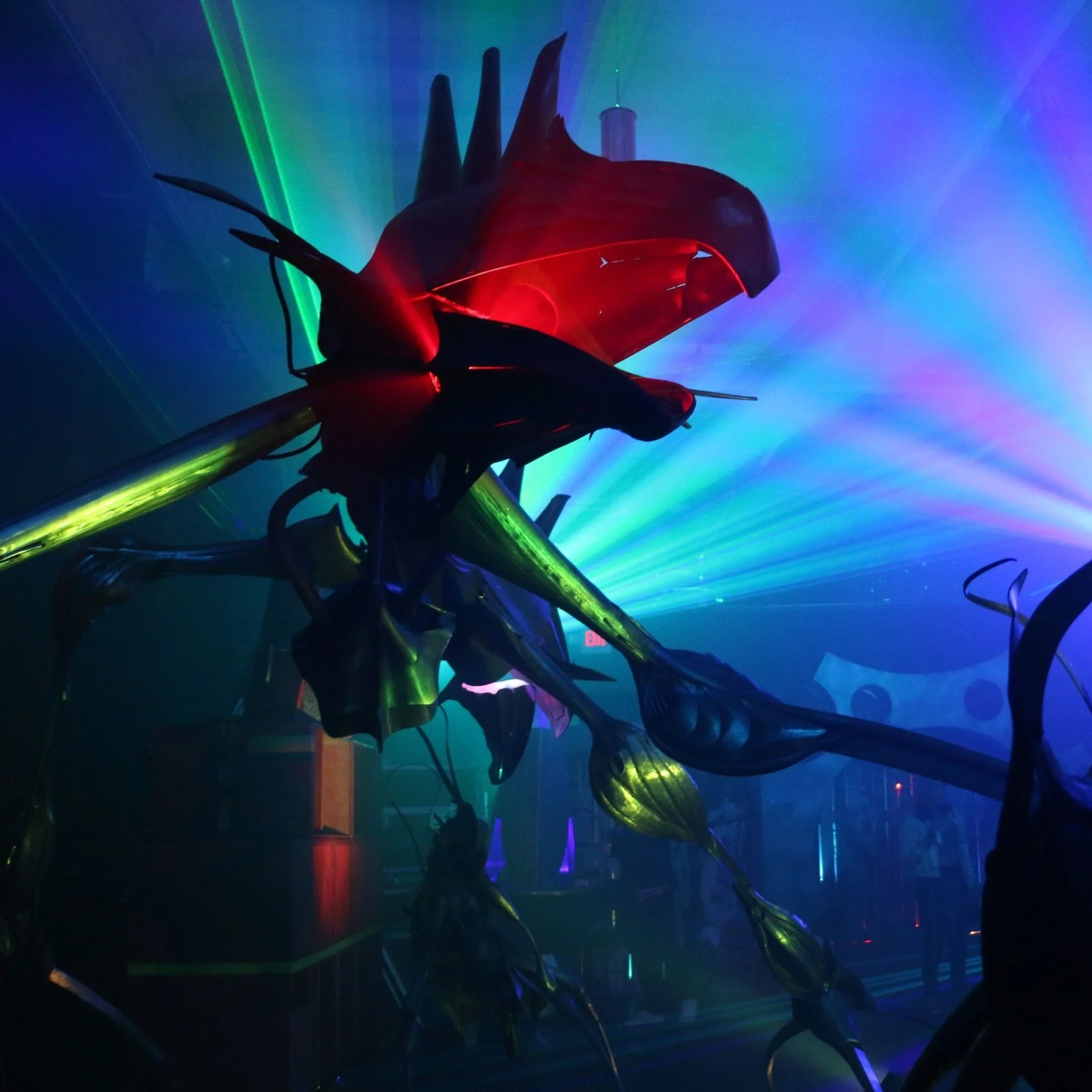 Gilly is a towering stainless steel sculpture — 21 feet long and 16 feet high — that channels a primal, alien beauty. Its form is both sensual and wild, exuding raw power as it breathes hallucinogenic flames from dual mouths and along its sinuous spine. These vibrant firebursts, capable of reaching over 1,200°F, erupt in cascades of liquid light, wrapping the sculpture in an otherworldly aura of heat and color.